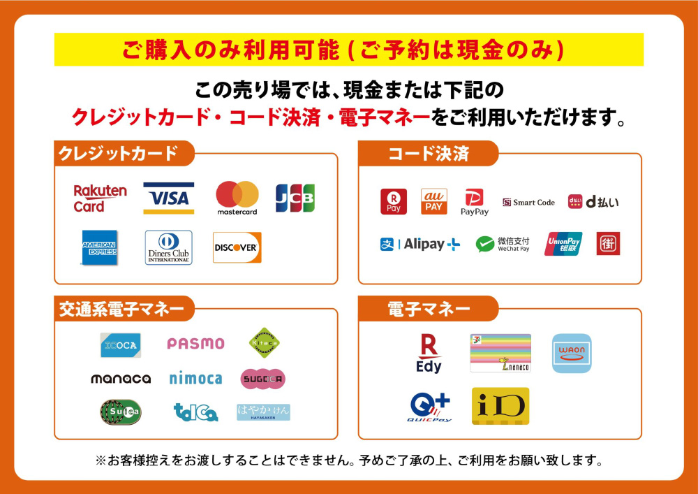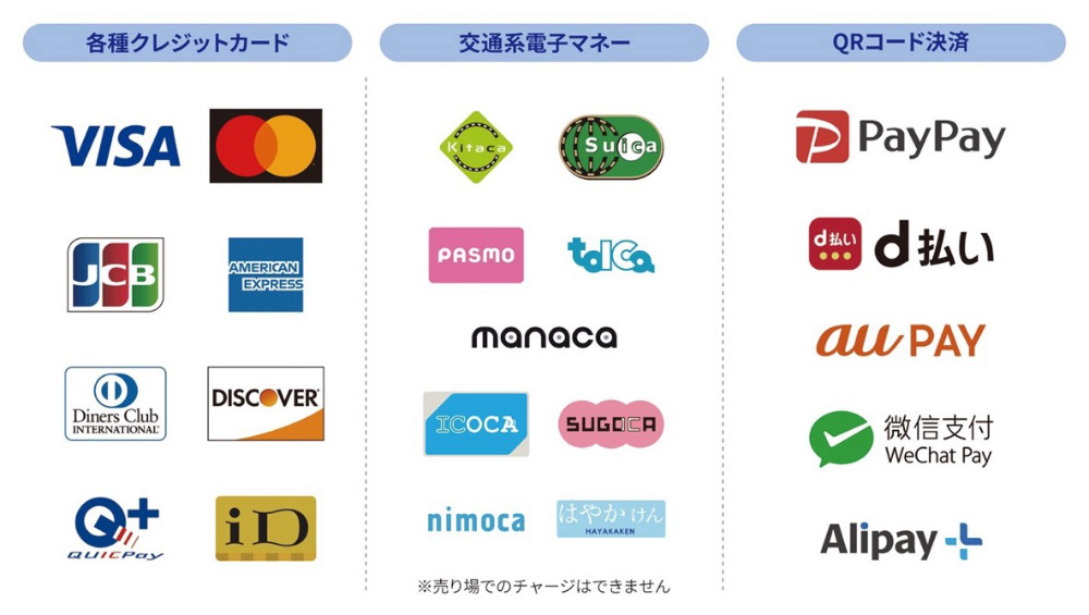 現金の他に、以下のクレジットカード・QRコード決済等のご利用が可能となります。